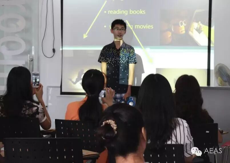 2016年5月28日上午十点,部分学员家长来到嘉华国际教育,参加五月家长会活动。家长会开始前的致辞环节中,嘉华教学总监刘浩老师对到场的各位家长致谢,感谢各位家长在休息日抽出宝贵的时间参加家长会,这体现了家长们对我们工作的支持。刘浩老师首先介绍了近期的留学政策变化,并就刚刚获得“澳大利亚悉尼科技大学“录取的赵育崧同学和在AEAS考试中分别取得78分、75分的郑京茜、张允然同学表示了祝贺,并勉励他们在今后的学习中加强努力,更进一步。 在刘浩老师对近期的教学工作和学生的学习状态进行了总体概述后,来自AEAS提高班的庄琰同学和刘柏辰同学,分别做了主题为《电影历史概述》和《中、澳环境对比》的英文演讲。 庄琰同学向大家介绍了电影的起源历史,影片分类以及在电影史中具有重要影响力的影视明星。刘柏辰同学首先向大家介绍了自己的基本情况和兴趣爱好,接着通过大量的示例图片和文字,展示了中国与澳大利亚不同的环境状况。两位同学的精彩演讲博得了在场家长的热烈掌声。 之后两位同学的任课老师Amy,对两位学生的演讲进行了点评,对同学们认真的学习态度和取得的进步予以了表扬。并向家长和学生说明,环境保护以及电影这类的主题,都是近期AEAS考试中常见的类型。不管是作文还是阅读听力口语,都常有涉足。因此要求学生在日常学习中,多了解相关内容,拓展知识面。 学生演讲结束后,各位家长与自己孩子的任课老师,进行了单独的交谈。交流了近期学生的学习和思想动态,并对教学工作提出了自己的建议。
